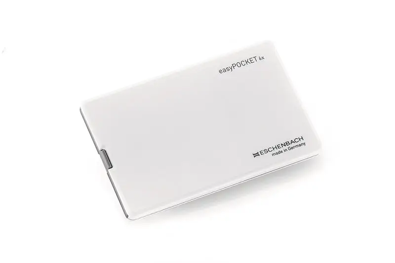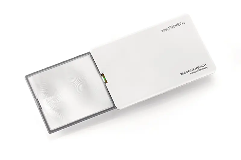 Available in 2.5x, 3x, 4x and 6x magnification, the easyPOCKET magnifiers feature a unique aspheric / diffractive hybrid lens that is distortion-free and only 3 mm thick. The lens is protected by a strong fiberlgass reinforced plastic case that minimizes scratching.